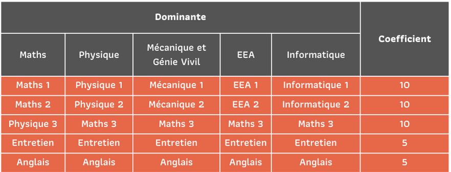 Les candidats admissibles passent cinq épreuves orales en fonction de la dominante de la dominante choisie lors de l’inscription. Leurs horaires de passage seront données dans la convocation qu’ils recevront par courrier électronique. Les candidats devront se présenter à chaque épreuve munis de leur pièce d’identité. Le tableau ci-dessous représente les matières présentées pour chaque dominante avec leurs coefficients.