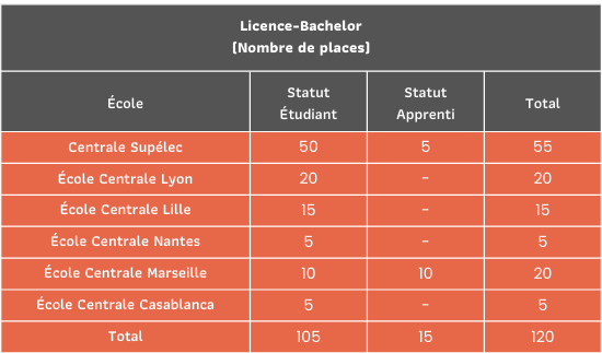 Le tableau ci-dessous donne le nombre de places dans chaque école à titre indicatif, chacune des écoles se réserve la possibilité de sélectionner les candidats selon ses critères :