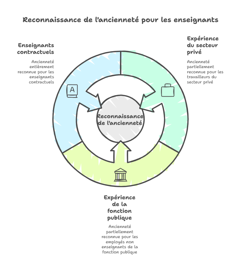 Exemple : Un enseignant contractuel ayant travaillé 5 ans à mi-temps sera reclassé avec 5 années d’ancienneté comme s’il avait travaillé à temps plein.